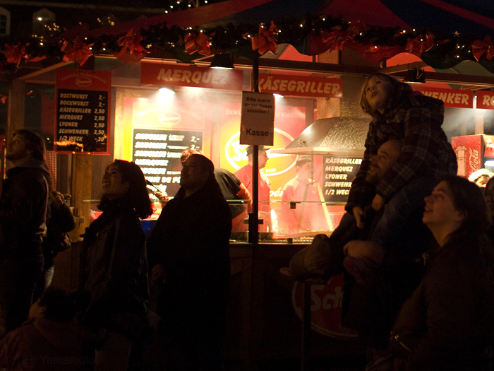 空に浮くヴァイナハツマンを見て楽しそうな雰囲気があります。いつもは行列が出来るソーセージ屋さんは客が一人もいなくて時間をもてあましています。